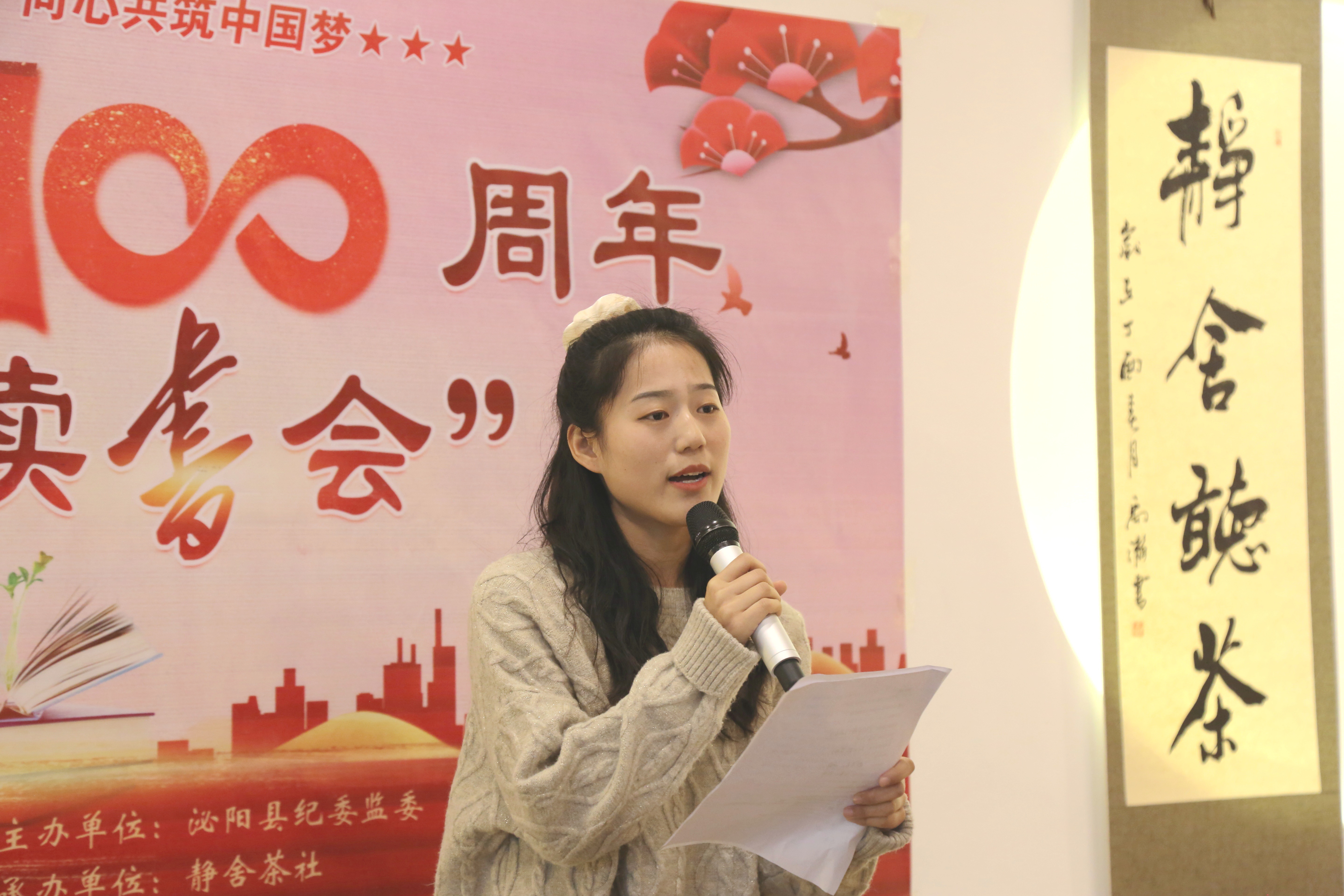 在讀書會(huì)上,泌陽縣紀(jì)監(jiān)委姚海洋同志介紹了泌陽縣焦竹園中共鄂豫邊革命根據(jù)地紅色歷史以及泌陽縣反腐倡廉宣教基地情況。縣紀(jì)監(jiān)委王茜同志講述了“信仰的力量”—河南英模風(fēng)采錄講述革命先烈陳香齋的感人故事《沖鋒陷陣鄂豫邊》;盤古星口才班主持人深情地講述了《趙一曼的故事》;新華書店的李杰朗誦了《黨是我心中明星》革命先烈的故事;文聯(lián)主席劉藝同志朗誦了王蒙的《青春萬歲》;“靜舍書茶社”劉靜同志朗誦了《我驕傲 我是中國(guó)人》;王沛和禹巖分別朗誦了自己寫的紅色詩(shī)篇和革命詩(shī)歌;融媒體中心記者于樂千同志朗誦了《長(zhǎng)征》;縣農(nóng)商銀行呂獻(xiàn)凱同志朗誦了革命詩(shī)歌;小朋友朗誦詩(shī)歌《延安,我把你追尋》等。