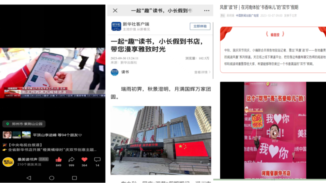 活動(dòng)期間,各地新華書店協(xié)同發(fā)力,通過體驗(yàn)式、沉浸式、互動(dòng)式的文化表達(dá)形式,將線上線下充分融合,吸引眾多媒體爭(zhēng)相報(bào)道。9月30日,新華社客戶端以“一起‘趣’讀書,小長(zhǎng)假到書店帶您漫享雅致時(shí)光”為題進(jìn)行報(bào)道;10月2日,#國(guó)慶的河南是書香味兒的#等活動(dòng)相關(guān)話題登上微博熱搜,閱讀量突破240萬次;10月3日,中央電視臺(tái)新聞?lì)l道對(duì)整體活動(dòng)進(jìn)行重點(diǎn)報(bào)道。此外,學(xué)習(xí)強(qiáng)國(guó)、中國(guó)新聞出版廣電報(bào)、河南日?qǐng)?bào)、河南電視臺(tái)、文旅中國(guó)、頂端新聞、今日頭條等權(quán)威媒體平臺(tái)共同聚焦報(bào)道,線上話題瀏覽量達(dá)到707.3萬次,全平臺(tái)總瀏覽量超2000萬次,有力實(shí)現(xiàn)了書香河南全民閱讀品牌的破圈傳播。