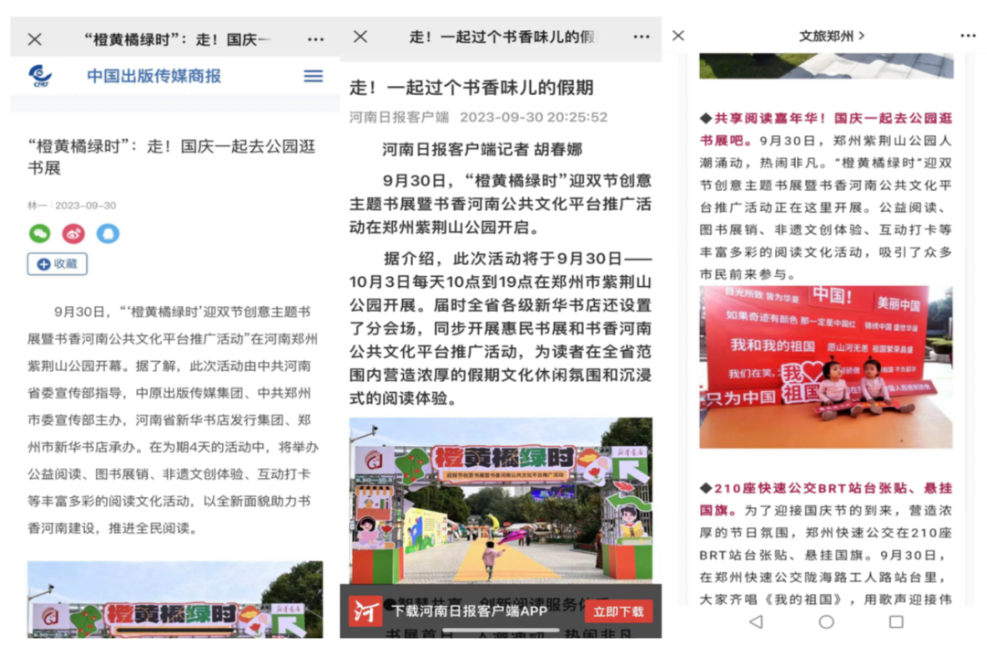 在剛剛結(jié)束的“雙節(jié)”8天小長(zhǎng)假中,由省委宣傳部指導(dǎo),中原出版?zhèn)髅郊瘓F(tuán)主辦,河南省新華書店發(fā)行集團(tuán)、全省各級(jí)新華書店聯(lián)動(dòng)承辦的“橙黃橘綠時(shí)”迎雙節(jié)創(chuàng)意主題書展暨書香河南公共文化平臺(tái)推廣活動(dòng),在全省市、縣(區(qū))文化地標(biāo)處圓滿舉辦。528場(chǎng)次的惠民書展、創(chuàng)意閱讀、潮流文旅、誦經(jīng)典、拆盲盒、手工制作等繽紛活動(dòng),深受人民群眾喜愛。
