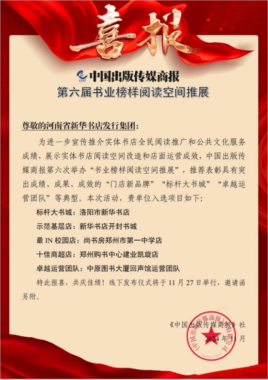 11月27日,由中國新華書店協(xié)會與中國出版?zhèn)髅缴虉舐?lián)合舉辦的“第六屆書業(yè)榜樣閱讀空間推展”發(fā)布活動于山西太原圓滿落幕。本次活動揭曉了包括“卓越運營團隊”“十大門店新品牌”“標桿大書城”“示范基層店”“格調(diào)社區(qū)店”“十佳商超店”以及“最I(lǐng)N校園店”在內(nèi)的七項推選結(jié)果,全面展示了書業(yè)領(lǐng)域的最新發(fā)展成就,并吸引了業(yè)界的廣泛關(guān)注。在此次推展活動中,河南省新華書店發(fā)行集團表現(xiàn)優(yōu)異,一舉斬獲五個獎項。
