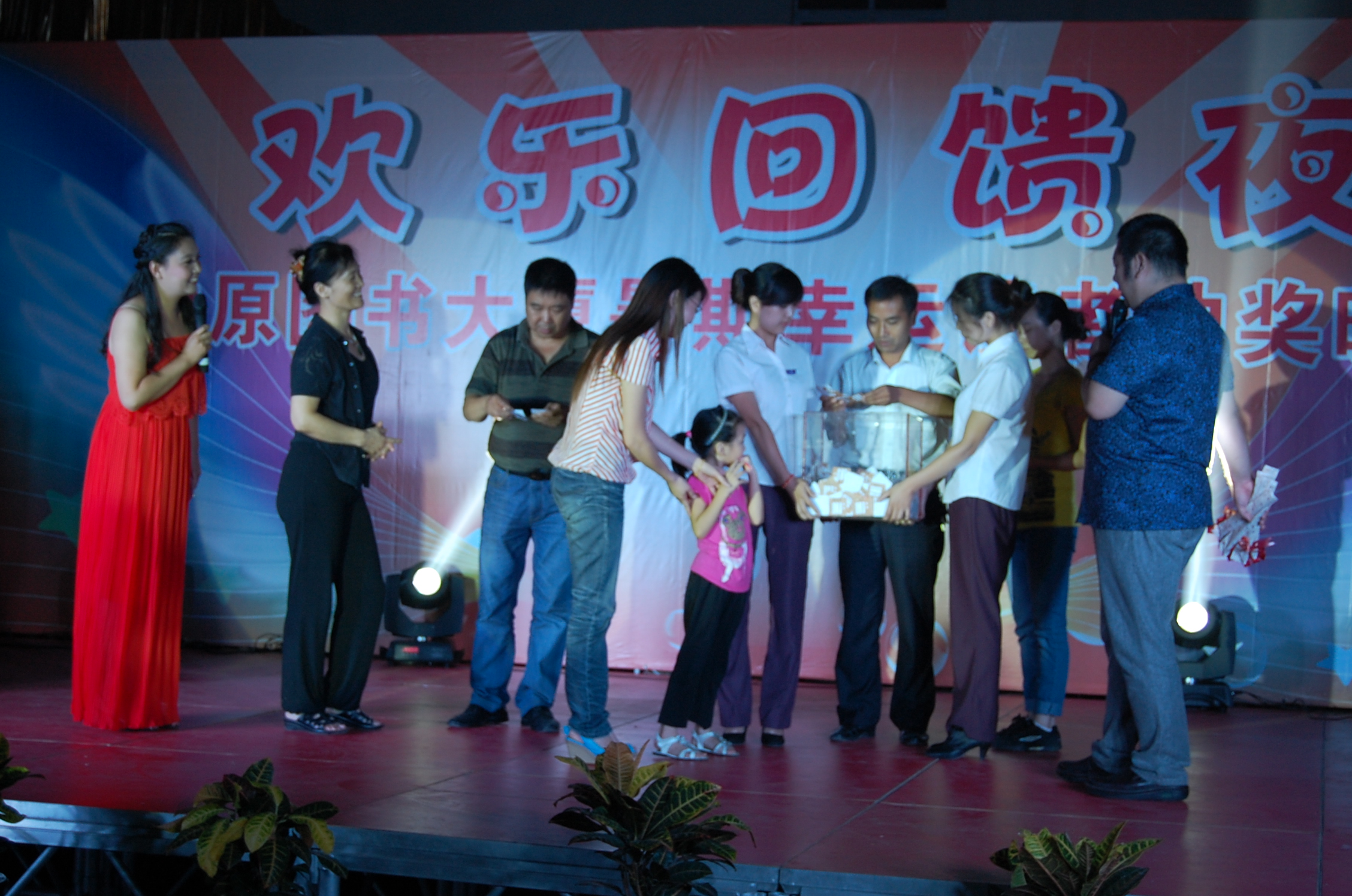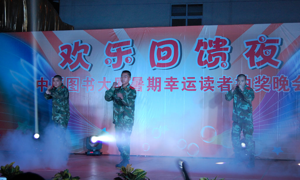 晚上,發(fā)行集團(tuán)員工同軍民共建合作單位武警鄭州支隊(duì)的戰(zhàn)士們一起為讀者奉獻(xiàn)出一臺富有激情的精彩晚會。街舞、獨(dú)唱、傣族舞、軍民對唱等一個(gè)個(gè)節(jié)目美不勝收,最后,武警戰(zhàn)士表演的團(tuán)體操擒拿格斗和發(fā)行集團(tuán)精心編排的合唱節(jié)目《紅旗頌》、《青春舞曲》、《愛我中華》等獲得現(xiàn)場觀眾最熱烈的掌聲,將整場晚會推向高潮,完美展現(xiàn)了軍民一家親的深厚情誼和發(fā)行集團(tuán)職工絢爛多姿的亮麗風(fēng)采。為回饋廣大讀者,中原圖書大廈推出了為期兩個(gè)月的《快樂暑期,幸運(yùn)連軸轉(zhuǎn)》抽獎(jiǎng)活動,本次晚會在文藝表演過程中穿插抽獎(jiǎng)內(nèi)容,出席晚會的領(lǐng)導(dǎo)和嘉賓,現(xiàn)場為獲獎(jiǎng)讀者頒發(fā)獎(jiǎng)品。
