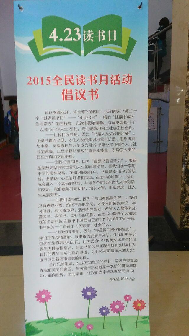 為更好營造書香社會,促進社會閱讀風尚的形成,提升民族文化素質,推進學習型城市建設,提高我店綜合收益,在4月23日世界讀書日來臨之際,新密市新華書店發(fā)出了2015年全民讀書月活動倡議書,提出了“美麗四月天,相約讀書日”閱讀主題,全力搞好宣傳,確;顒尤〉脤嵭,該店利用電子顯示屏、張貼海報、賣場布置等手段進行宣傳,營造氛圍,并積極組織開展流動售書活。