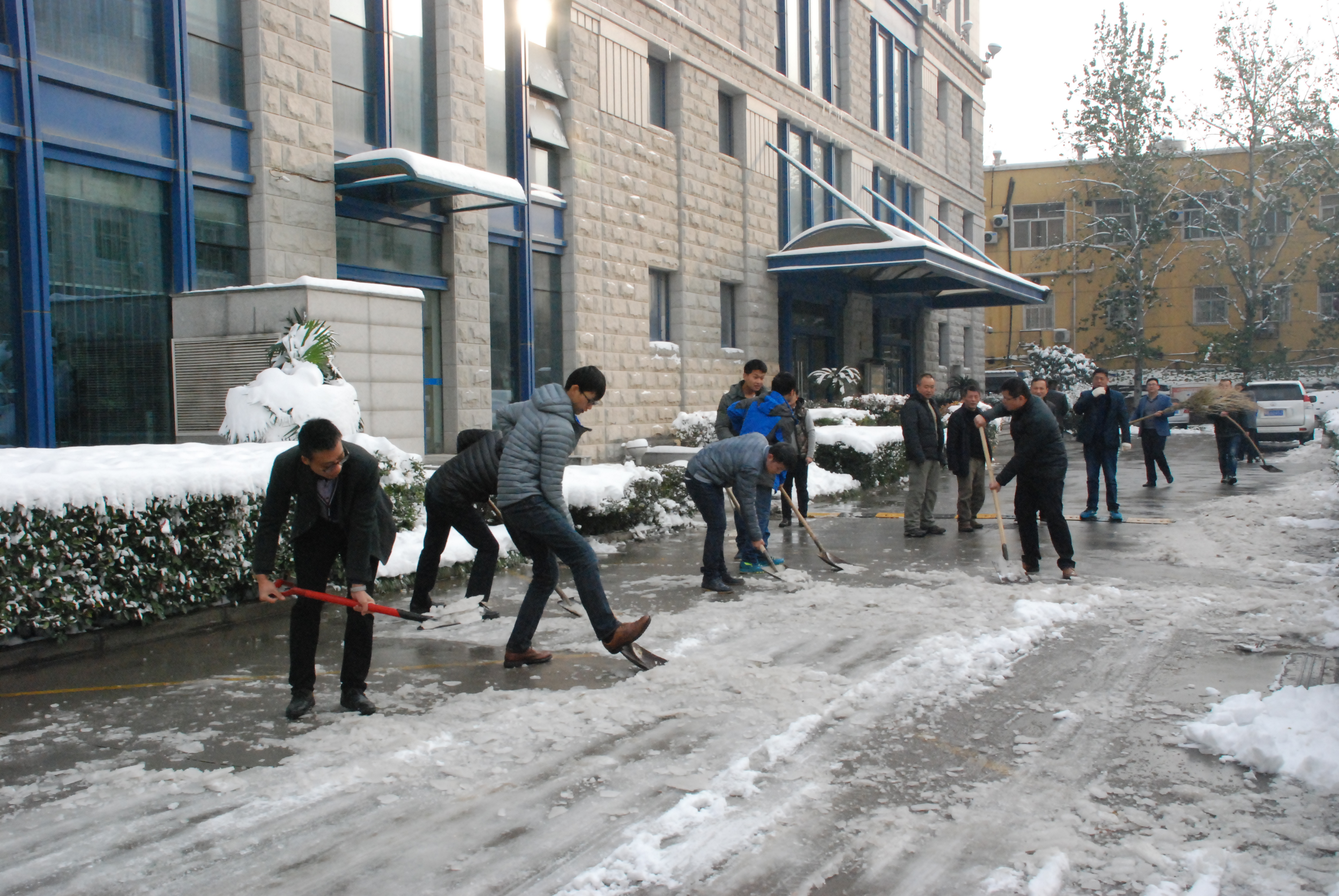 11月22日,大雪席卷鄭州,形成較厚積雪,帶來出行不便。第二日清晨,發(fā)行集團領導和各部室員工克服交通困難,早早趕來,鏟冰掃雪,及時清障,確保了公司院內(nèi)道路通暢。